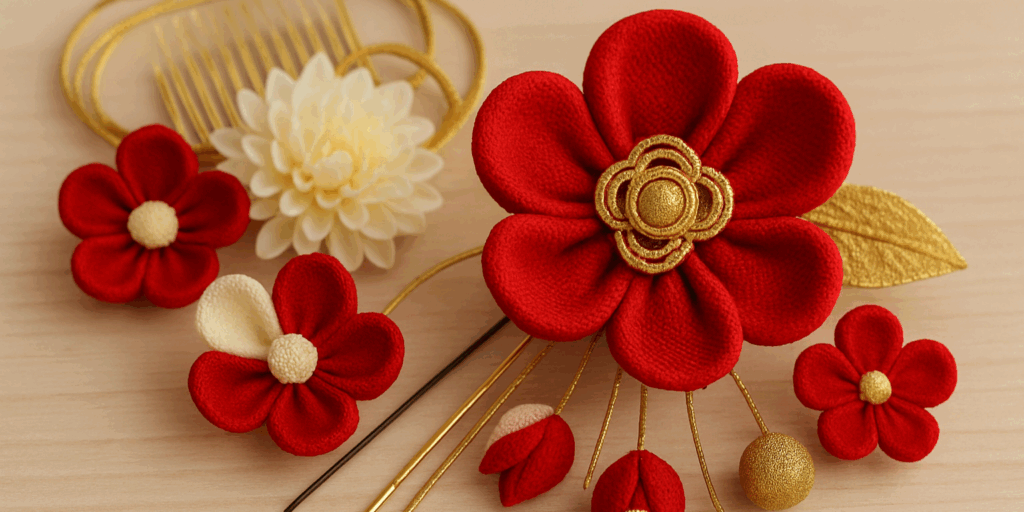 特に人気なのは、赤・白・金・つまみ細工を合わせた王道タイプ。和装に最も馴染み、誰にでも似合いやすいデザインです。