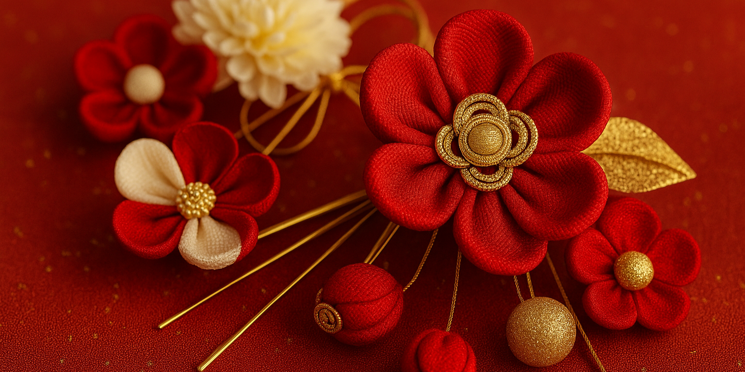 特に人気なのは、赤・白・金・つまみ細工を合わせた王道タイプ。和装に最も馴染み、誰にでも似合いやすいデザインです。